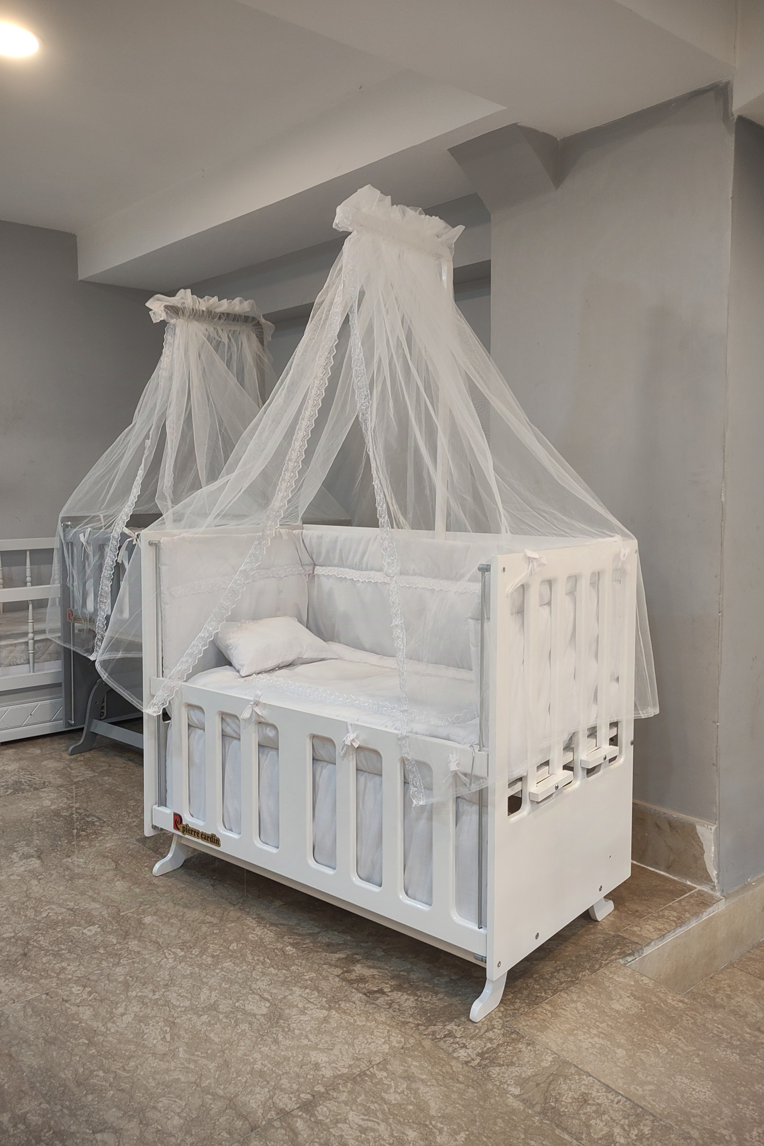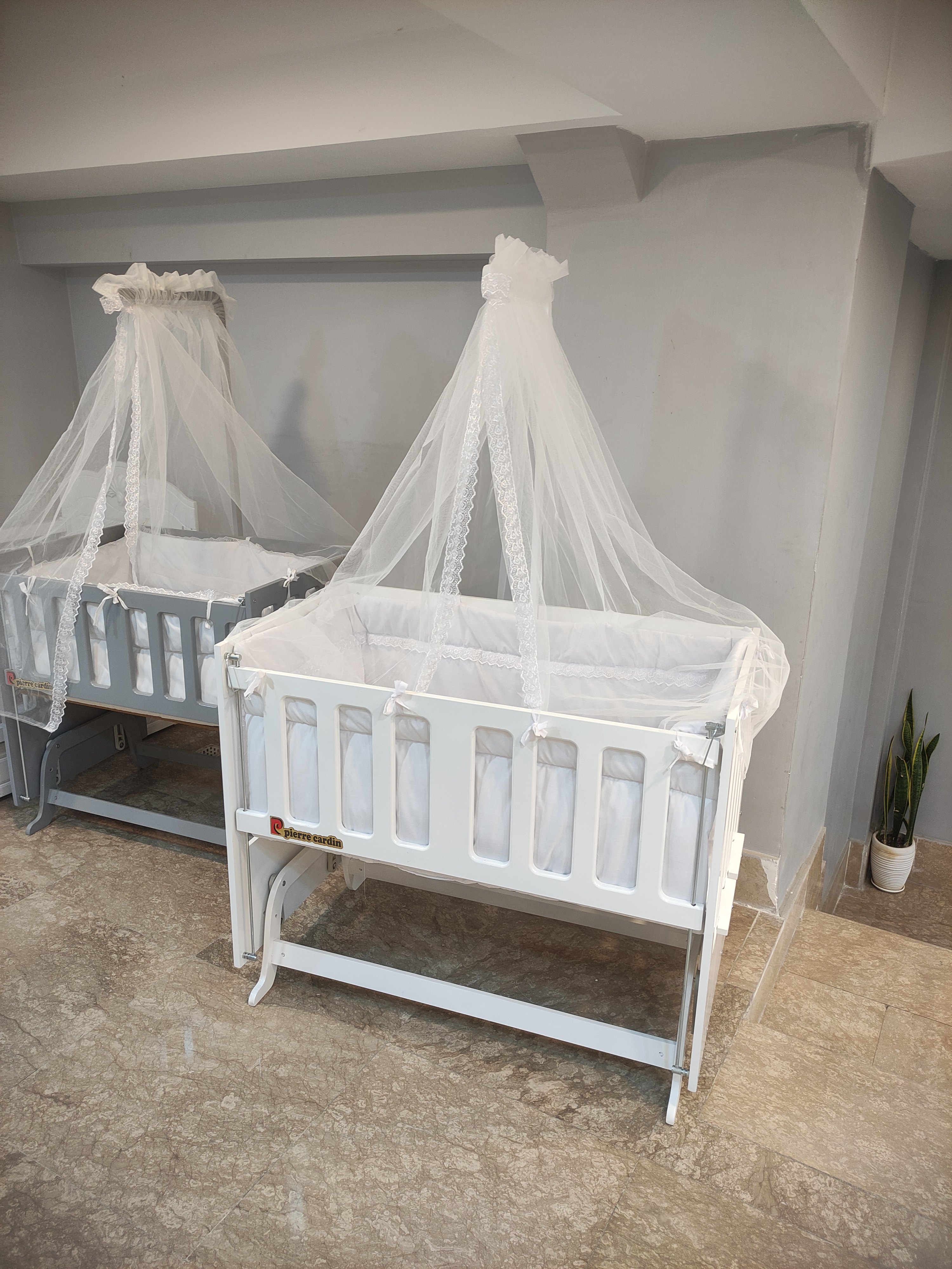 تخت کنار مادر گهواره ای مدل پییرکاردیین در سایز ۱۱۰در۶۰ رنگبندی کار سفید طوسی و کرم هستش این تخت کنار مادر گهواره هم هستش و در سنین سه و بالاتر کودک که به عنوان گهواره و تخت نمیشه استفاده کرد تبدیل به میز تحریر میشود