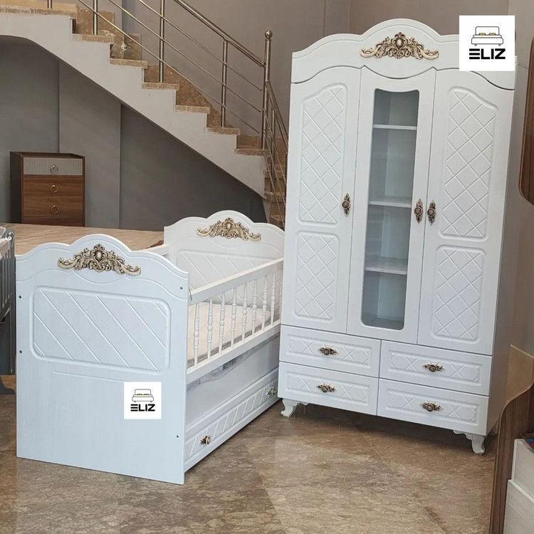 تخت نوزادی با ابعاد تشک خور ۱۳۰ در ۷۰سانتی متر با یک کشوی چرخدار زیر تخت ،یک نرده متحرک و یک نرده آسانسوری میباشد